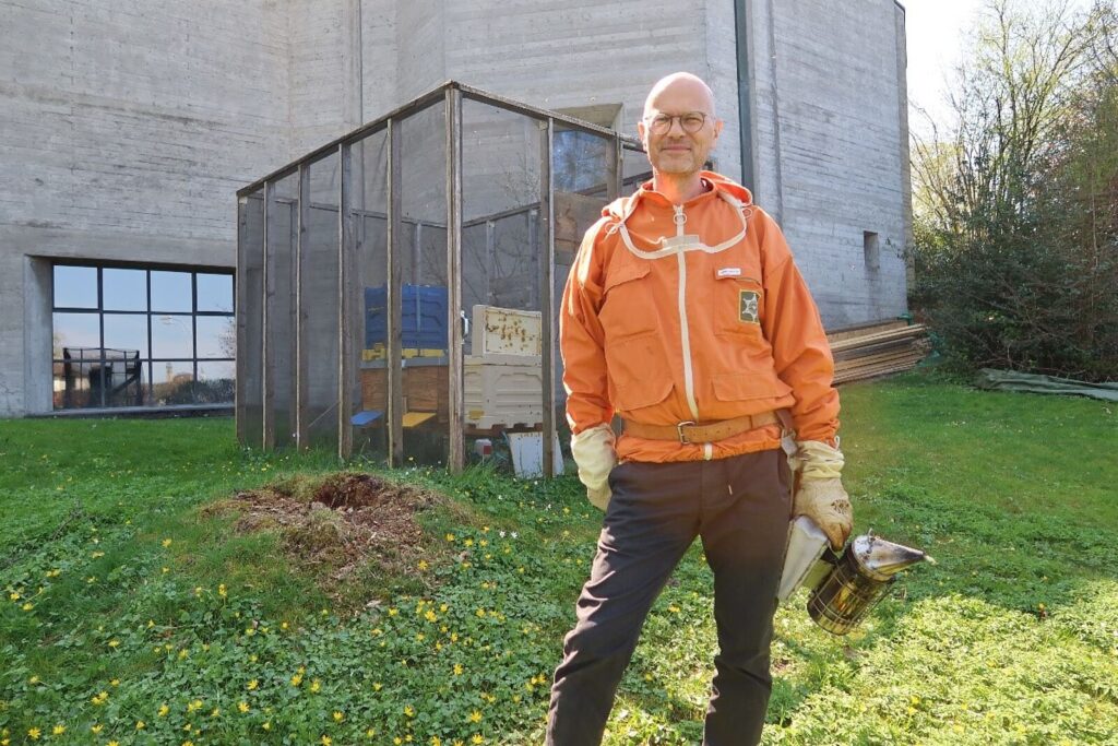 Seit März 2025 wohnen zwei meiner Bienenvölker im Quartier Garten Michael. Vorgänger Nick Meier hat einen Stand konzipiert, dem sich Interessierte gefahrlos näher können: ein feines Gitter zwingt die Bienen, hoch hinaus zu fliegen. So ist das Risiko, gestochen zu werden, richtig klein. Mein Tipp: keine starken Düfte (Parfüm, Haargel etc.) in der Nähe von Bienenvölkern.