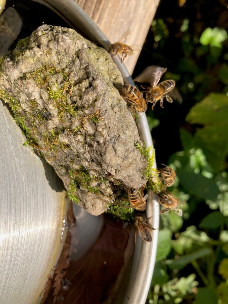 Bienen brauchen Wasser zum Leben. Während andere Arbeiterinnen Nektar, Pollen und Harz (für Propolis) holen, sind diese Bienen hier Wasserträgerinnen. Besonders an sommerlichen Hitzetagen ist es wichtig, dass sie nicht weit zu dafür fliegen müssen.